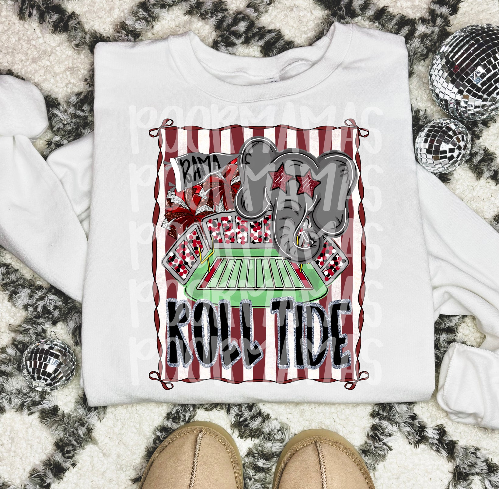 Show your Bama pride with this high-resolution Alabama Crimson Tide Stadium PNG! Featuring a bold Roll Tide elephant, stadium background, and crimson game-day vibes, this design is perfect for football fans, gameday shirts, hoodies, sweatshirts, mugs, and more.