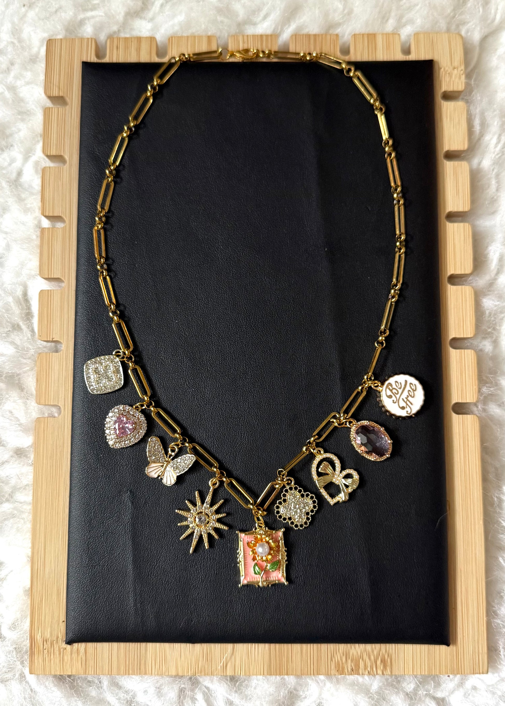 Add a touch of personality and sparkle to your style with our Gold Charm Necklace. This one-of-a-kind piece features a chunky gold link chain adorned with unique charms—including a butterfly, sunburst, sparkling hearts, a bow, a floral medallion, a gemstone, and a “Be Free” pendant.